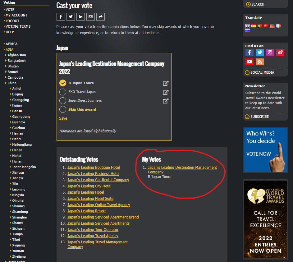 こちらのリンクに入ってください: https://www.worldtravelawards.com/vote-r4-c96#votenow