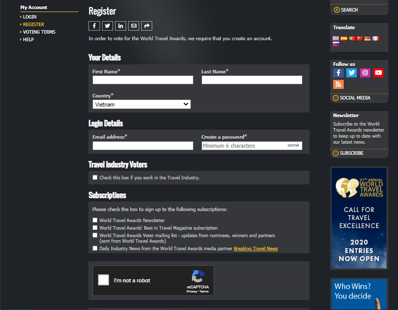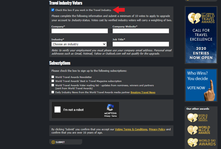 こちらのチェックボックスをチェックします ‘Check this box if you work in the Travel Industry. 旅行業界関係者の方の場合(ホテル、旅館、代理店など)、投票は2票としてカウントされ、旅行業界以外の人の票は1票としてカウントされます。
